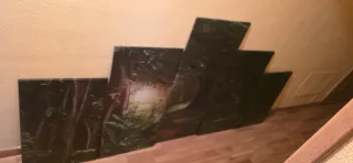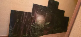Conjunto de cinco cuadros decorativos con una escena de bosque. - Medidas: dos de 60cm, dos de 80cm y uno de 100cm.
