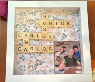 Marco decorativo con foto y letras de Scrabble. - Foto de pareja. - Letras de madera con nombres. - Frases personalizadas - Adornos de corazones y estrellas. - Hechos totalmente a mano con mucho cariño.