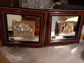 Conjunto de dos cuadros decorativos con relieve. 19,5 ancho x 17, 5 alto - Diseños italianos. - Marcos de madera con detalles dorados. - Relieves en metal con acabado plateado y dorado.