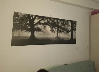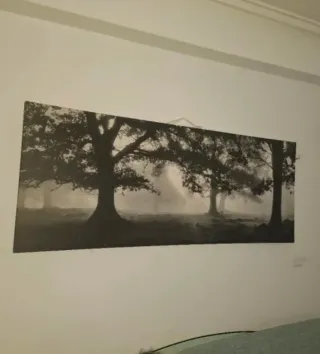 Lámina cuadro de gran formato. es una fotografía preciosa con la luz atravesando las hojas de los árboles. La sensación que da es maravillosa. La compré para la oficina, luego la puse en casa. queda bien en cualquier ambiente. Se vende desmontada.