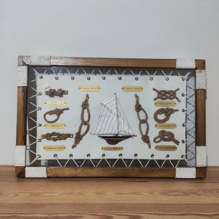 Precioso cuadro decorativo con diferentes nudos marineros, ideal para amantes de la náutica. Se encuentra en muy buen estado. - Muestra una colección de nudos náuticos. - Incluye miniaturas de objetos marineros. - Marco de madera marrón con detalles en metal dorado.
