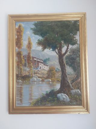 Cuadro de paisaje óleo pintado a mano, con una escena fluvial y montañosa. Firmado por el artista - Marco dorado con detalles. - Representación de una cabaña junto a un río. - Tonos verdes y ocres predominantes.