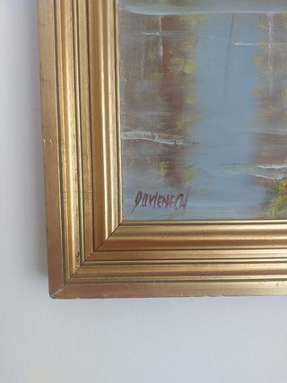 Precioso cuadro de paisaje al óleo sobre lienzo, enmarcado en madera dorada. El cuadro representa una escena bucólica con un lago, árboles y una casa en el fondo. - Pintado al óleo sobre lienzo. - Enmarcado en madera dorada. - Medidas aproximadas: [Añadir medidas] - Firmado por Domenec.