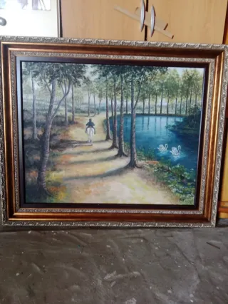 Precioso cuadro pintado al óleo que representa un paisaje sereno con un caballo y un lago y cisnes. - Escena de naturaleza con árboles y agua. - Detalle de un caballo y dos cisnes nadando en el lago. - Marco de madera con detalles ornamentales.