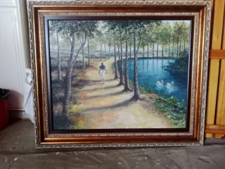 Cuadro al óleo: Paisaje con caballo y cisnes