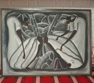 Cuadro decorativo con figuras humanas en tonos grises y blancos, óleo, traido de la Republica dominicana, pintado a mano. El marco está hecho de madera color gris oscuro.( no envio ) - Diseño abstracto. - Marco de madera.