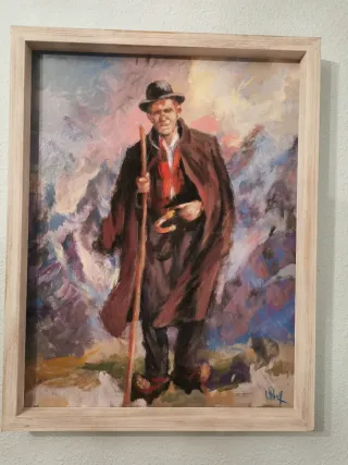 Pintura al óleo sobre madera de Indalecio Sobrino.firma muy reconocida entre los pintores de obra contemporánea - Técnica: Óleo sobre tabla. - Representación vestimenta costumbrismo rural, en un hombre con bastón y sombrero a principios del siglo pasado. Medidas de 49 ×64 Enmarcado