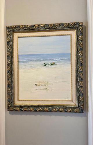 Precioso cuadro al óleo que representa una escena de playa en Cantabria con una mujer y cestas. Firmado por la artista Ana F, pertenece a una colección expuesta en Santander - Pintura original. - Marco con detalles dorados y trenzados.