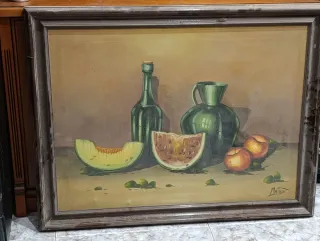 Cuadro al óleo del reconocido artista Mataix. Una naturaleza muerta con frutas y recipientes. Bodegón original Del artista José Antonio Mataix,Alcoyano - Firmado por el artista. - Marco incluido.