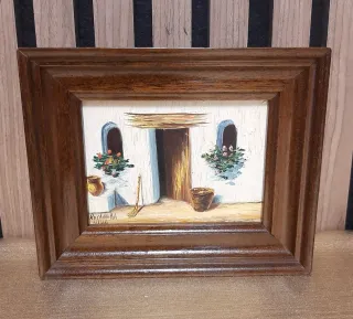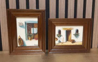 Conjunto de dos cuadros pintados al óleo con escenas mediterráneas. - Artista: Rocamora - Medidas: 14 × 17 cm. - Representan fachadas blancas con detalles de macetas y elementos decorativos. - Marcos de madera con acabado en tono oscuro.