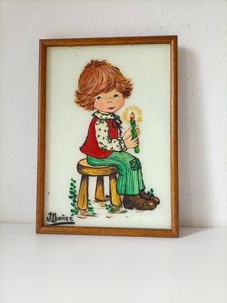 Conjunto de dos cuadros decorativos, cada uno con una ilustración de un niño y una niña. - Pintura al óleo sobre cristal. - Marco de madera. - Ilustraciones detalladas de figuras infantiles.