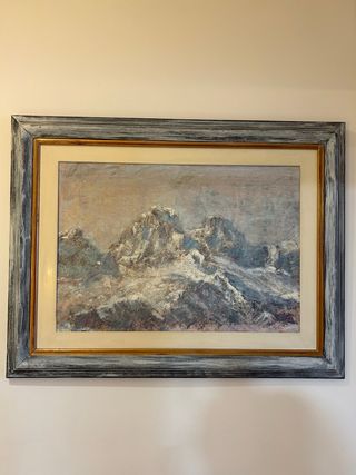 Precioso cuadro pintado al óleo que representa un paisaje de la Peña Oroel cubierta de nieve. La obra captura la majestuosidad de la naturaleza con un estilo expresionista. - Técnica: Óleo sobre lienzo. - Marco de madera con acabado envejecido.