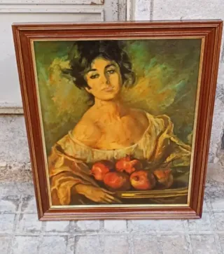 Pintura al óleo de una mujer sosteniendo granadas.71x59. con señales de uso. Más artículos en mi perfil. Más artículos en mi perfil. - Marco de madera. - Tonos verdes y marrones.
