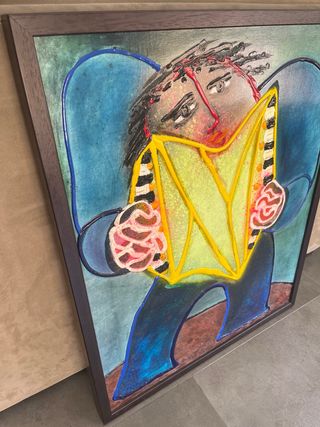 Pieza artística original del reconocido pintor Ripolles. Combina técnicas de cuadro y escultura para crear una obra única. - Representación de una figura tocando la guitarra. - Textura tridimensional en la figura y el fondo. - Colores vibrantes y llamativos.