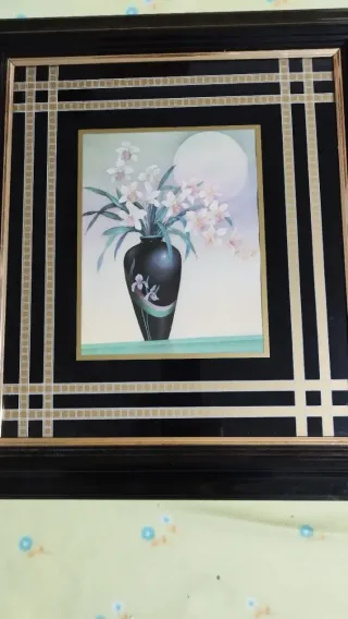 Elegante cuadro decorativo con un jarrón de flores y una luna. - Marco de madera y cristal. - Detalles en dorado.