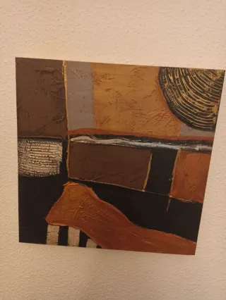 Este lienzo decorativo aporta un toque moderno a cualquier espacio. Presenta un diseño abstracto con texturas y colores que combinan tonos marrones y púrpuras. Se venden juntos o por separados 5 euros cada uno 50 x 45 cm - Diseño abstracto. - Texturas variadas. - Combinación de colores marrón y púrpura.