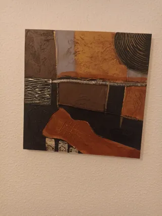 Cuadro decorativo con diseño abstracto y moderno. - Pieza única con formas geométricas. - Combinación de texturas y colores. - Ideal para añadir un toque artístico a tu hogar.