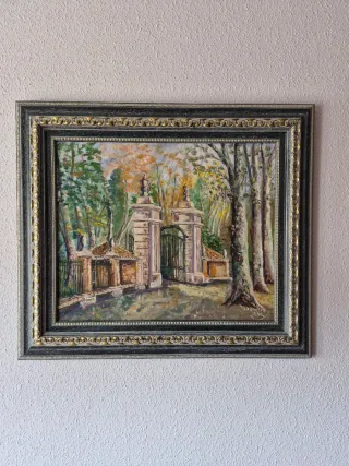 Precioso cuadro al óleo que representa una escena de Aranjuez. La obra está enmarcada en madera dorada. - Pintura al óleo. - Marco de madera. - Pintado en 1992. Representa la Puerta del Jardín del Príncipe en Plaza Redonda. - En medidas 82x71