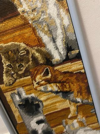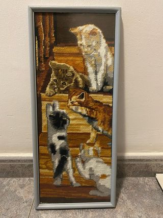 Precioso cuadro tejido a mano con una escena de gatitos. - Representación detallada de varios gatitos. - Marco incluido.