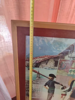 Cuadro con un diseño collage que combina escenas urbanas y paisajes de Euskal Herria. - Marco de madera. - Múltiples imágenes integradas.