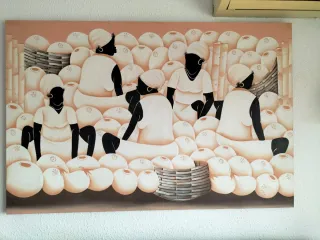 Cuadro original pintado a mano que representa una escena de mercado. - Representación vibrante de un mercado. - Colores vivos y detallados.