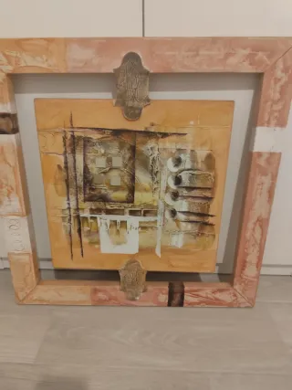Pieza de arte abstracto con un diseño único. - Marco con detalles en metal y madera. - Tonos tierra y texturas variadas.