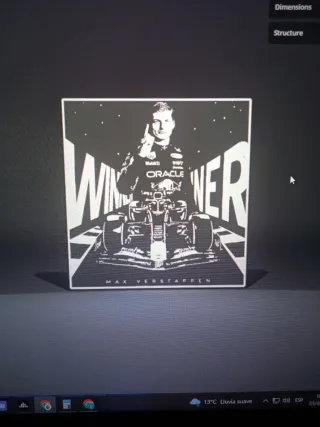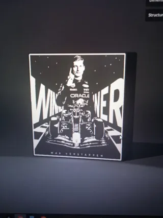 Cuadro luminoso con diseño de Max Verstappen y su monoplaza de Red Bull Racing. Ideal para aficionados a la Formula 1. -Dimensiones 17.7cm x 17.1cm x 4.1cm - Diseño en blanco y negro. - Impreso en PETG.