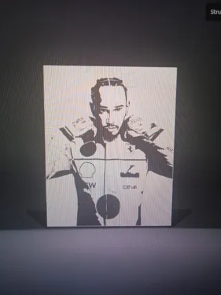 Cuadro luminico decorativo con la imagen de Lewis Hamilton. - Dimensiones 17.5cm x 14.1cm x 2.1cm - Diseño moderno y llamativo. - Impreso en PETG