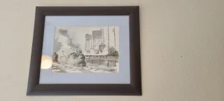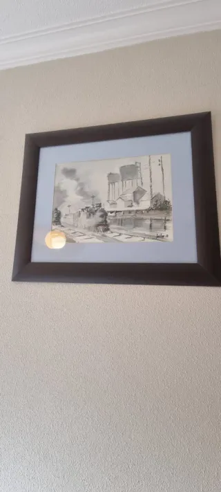 Se venden 2 cuadros a 10 euros la unidad si compras los 2 se quedan en 15 euros. Preciosa acuarela de un paisaje ferroviario . Perfecta para decorar cualquier espacio. - Marco de madera color café. - Passepartout azul claro.