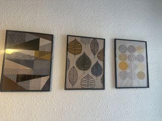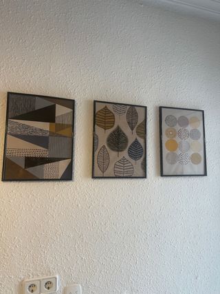 Conjunto de tres cuadros con diseños modernos y abstractos, perfectos para añadir un toque de color y estilo a cualquier estancia. - Marco de madera. - Impresión en papel de alta calidad. - Diseños geométricos y de hojas. - Tonos beige y multicolor.