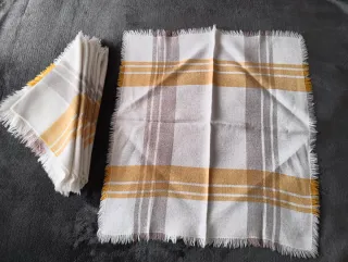 Conjunto de nueve servilletas de tela con un diseño a cuadros en tonos blancos y amarillos. - Diseño a cuadros. - Acabado con flecos.