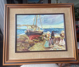 Precioso cuadro al óleo con una escena costera, listo para colgar. Firmado, copia Soroya - Marco de madera con detalles. - Lienzo con textura de tela.
