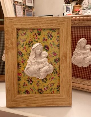 Virgen de la familia o de la esperanza, enmarcada con diferentes estampados con tela liberty. Se pueden personalizar, tanto el tamaño del marco como el color del marco y la tela del estampado. Entre la tela y la virgen de marmolina incluye el cristal para que la tela no acumule polvo y pierda color. Medidas Marco pequeño: 10x15 cm - 15 € Medidas Marco mediano: 13x18 cm - 16 € Medidas Marco grande: 15x20 cm - 18 € Desde 15€