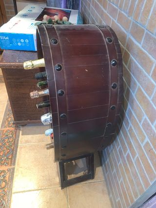 Elegante botellero de estilo vintage con capacidad para varias botellas. - Diseño inspirado en barrica. - Acabado en madera oscura con detalles dorados.