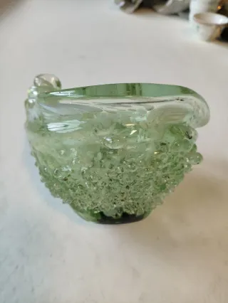 Precioso cuenco decorativo con un diseño inspirado en una concha marina. Su acabado translúcido y los detalles internos le dan un toque artístico único. - Forma de concha. - Diseño artístico con inclusiones. - Material de cristal soplado, con técnica bullicante (burbujas controladas) - Entrega en mano en Cuarte de Huerva
