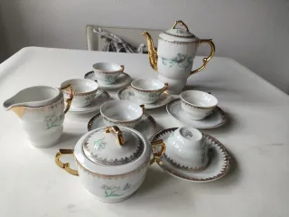Elegante juego de té de porcelana de la marca Santa Clara. Incluye tetera, azucarero, lechera y seis tazas con sus platos. - Diseño floral delicado. - Detalles dorados en asas y bordes. - Piezas de alta calidad. - Entrega en mano en Cuarte de Huerva