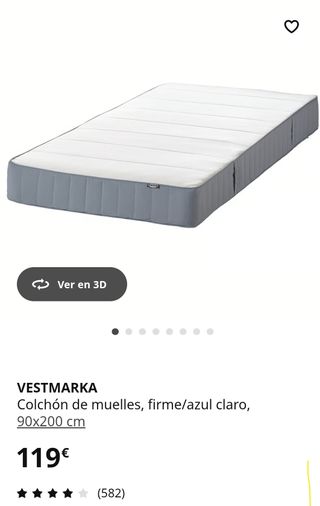 Colchón Vestmarka de Ikea con una semana de uso. Ofrece comodidad para un descanso reparador. Lo compré en Ikea el 11 de febrero (por 119 euros, tengo el ticket como prueba) porque vinieron amigos a casa y me faltaba un colchon para así evitarles que pagarán un hotel y lo vendo ahora porque ya no me hace falta. Solo tiene 1 semana de uso y está nuevo y limpio como de la tienda ya que puse protector de colchón durante el uso de la semana. Se regala sabana bajera a la medida de Ikea. Lo tengo ya embalado y protegido para guardar por si no lo vendo. No se hacen envíos. - Medidas: 90 cm (ancho) x 200 cm (largo). - Grosor: 18 cm
