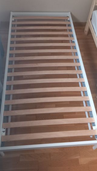 Estructura de cama individual VEVELSTAD de IKEA con una semana de uso. Lo compré en Ikea el 11 de febrero (por 69.99 euros, tengo el ticket como prueba) porque vinieron amigos a casa y me faltaba una cama para así evitarles que pagarán un hotel y lo vendo ahora porque ya no me hace falta. Solo tiene 1 semana de uso por lo que está nuevo. Lo tengo ya embalado y protegido para guardar por si no lo vendo. No se hacen envíos. - Medidas: 90x190 cm. - Color blanco. - Fabricada en metal.