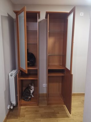 Conjunto de dos estanterías altas de madera con puertas de cristal. - Diseño moderno y elegante. - Estructura de madera resistente. - Puertas con acabado en cristal translúcido.