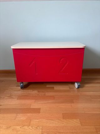 Práctico baúl de almacenaje con un diseño moderno y divertido, ideal para guardar juguetes o mantas. Cuenta con ruedas para facilitar su movilidad, y bloqueadores de ruedas para evitar movimientos indeseados. - Diseño con números 1 y 2. - Tapa de madera clara. - Ruedas grises. - Medidas visibles en las fotos