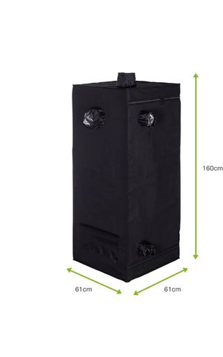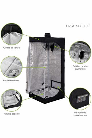 Armario de cultivo con interior reflectante. - Cintas de velcro para cierre. - Fácil de montar. - Amplio espacio interior. - Salidas de aire ajustables. - Ventana de visualización. Medidas 1,60x0,61
