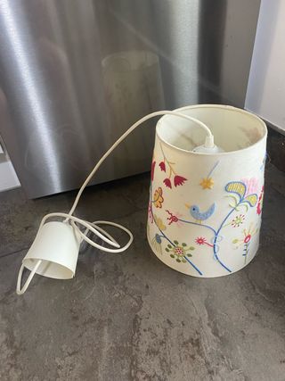 Bonita lámpara de techo con un diseño infantil bordado. - Tela con bordados de flores y pájaros. - Base de plástico.