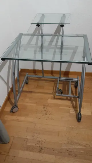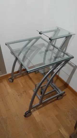 Mesa de ordenador con un diseño moderno y funcional. - Superficie de cristal. - Estructura de metal. - Ruedas para fácil movilidad.Recojer en zaragoza