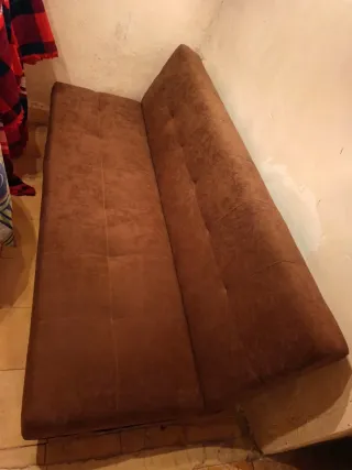 Sofá cama de tela en color marrón. Un mueble práctico y cómodo. Siempre ha estado enfundado, uso casual en segunda vivienda. Se recoge en Tarazona. - Diseño moderno y funcional. - Tapicería suave al tacto.