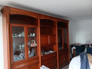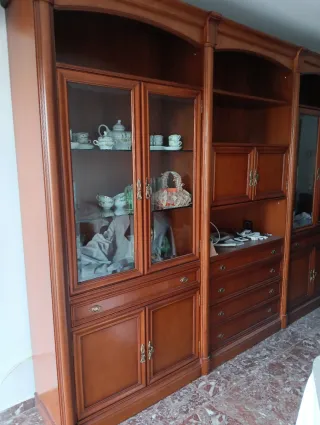 Elegante librería para salón fabricada en chapa de cerezo barnizada. Sus acabados le dan un toque cálido y sofisticado a cualquier espacio. Recoger en piso de Zaragoza - Diseño clásico con puertas de cristal y madera. - Tiradores dorados. - Amplio espacio de almacenamiento.
