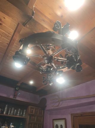Elegante lámpara de techo con un diseño rústico que aporta calidez a cualquier espacio. Su combinación de materiales le da un toque único. - Estructura principal de metal. - Detalles en madera. - Color negro y marrón.