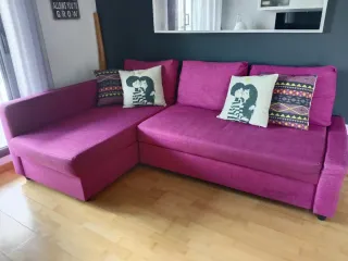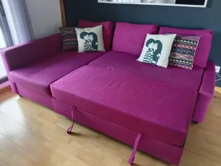 Sofá cama de IKEA modelo FRIHETEN en un vibrante color fucsia. EDICIÓN LIMITADA. Este sofá es perfecto para optimizar el espacio en tu hogar. Muy cómodo y práctico. Se convierte fácilmente en cama grande. Arcón de almacenamiento bajo el chaiselonge, el cual se puede montar tanto a izquierda como derecha. Se entrega desmontado. Fácil montaje. - Tapicería de tela. - Diseño moderno y funcional.