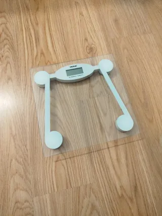 Báscula digital de Ikea con una base de cristal y detalles en plástico blanco. - Diseño moderno y minimalista. - Pantalla digital clara para fácil lectura.