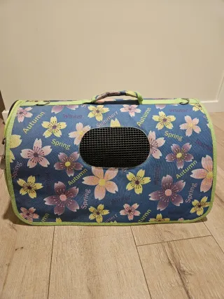 Transportín para mascotas con un bonito estampado floral. - Diseño con flores en tonos rosas, amarillos y morados. - Borde y asas en color verde lima. - Ventana de malla para ventilación.