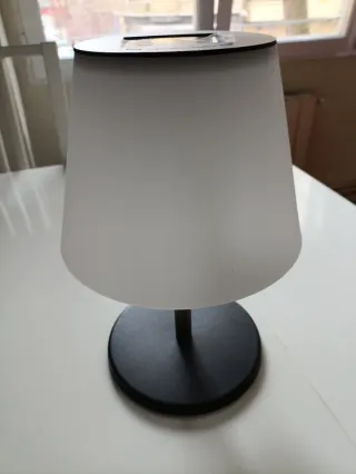 Lámpara de diseño moderno, ideal para exteriores. - Funciona con energía solar. - Base y estructura en color negro. - Pantalla en color blanco.
